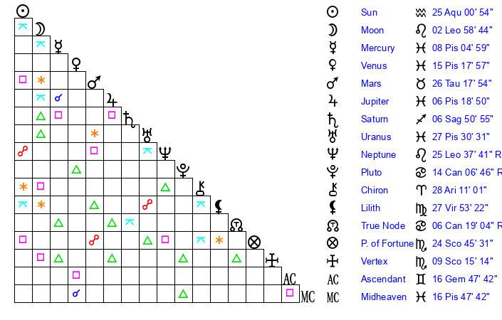 | Sun | 25 Aquarius 1 | 26 Aquarius 15 | 1 Gemini 33 |