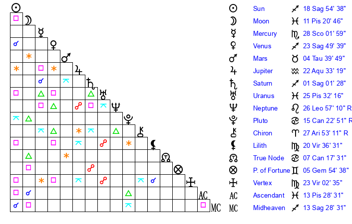 | Saturn | 1 Sagittarius 26 | 25 Pisces 13 | 8 Sagittarius 6 |