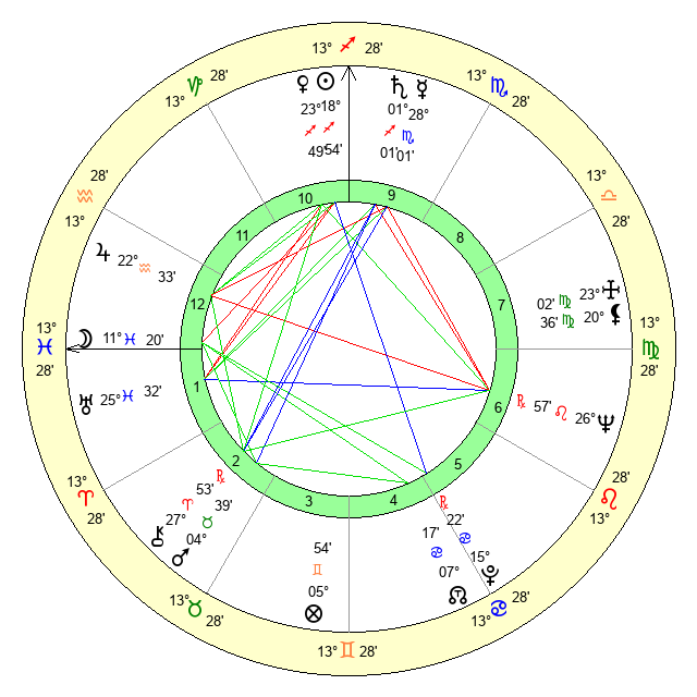 | Moon | 11 Pisces 19 | 18 Virgo 1 | 23 Libra 51 |