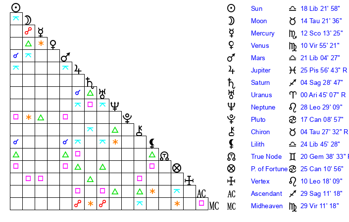 | Sun | 18 Libra 22 | 19 Libra 37 | 27 Capricorn 23 |