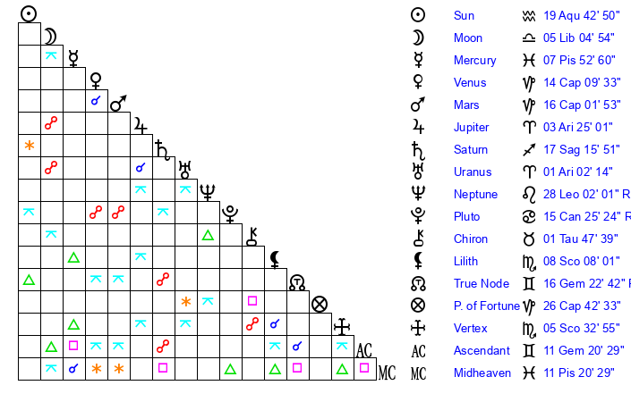 | Moon | 5 Libra 4 | 16 Cancer 46 | 15 Aries 27 |