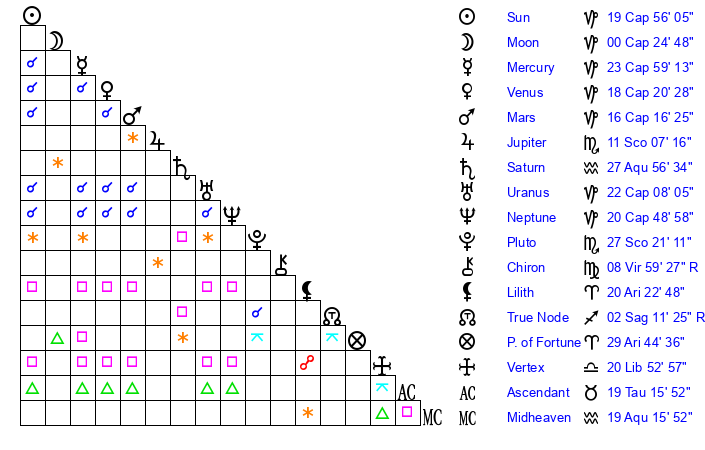 | Moon | 0 Capricorn 26 | 5 Gemini 21 | 19 Aquarius 9 |