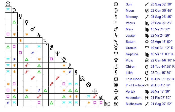 | Sun | 23 Sagittarius 32 | 24 Sagittarius 13 | 26 Pisces 39 |