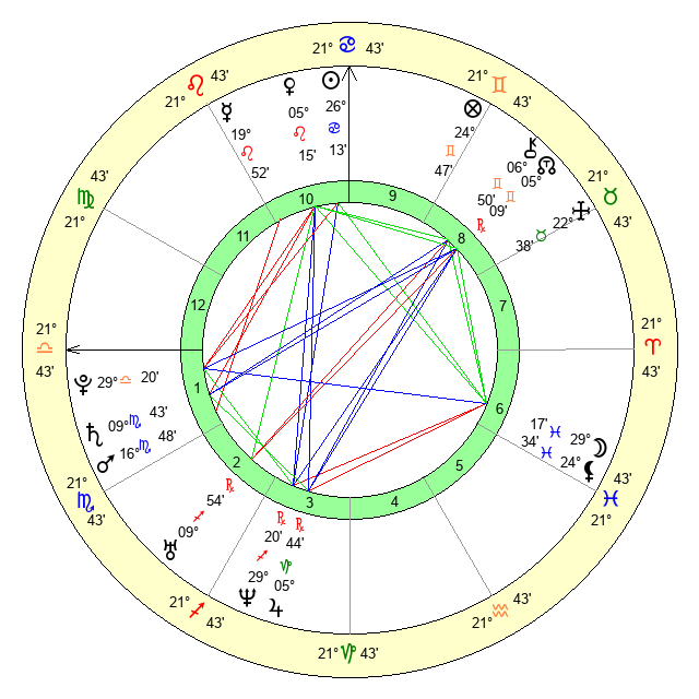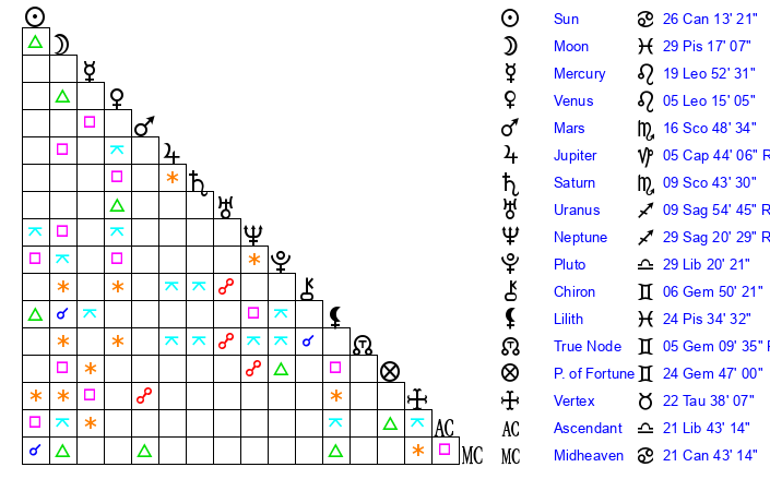 | Sun | 26 Cancer 14 | 26 Cancer 19 | 5 Virgo 33 |
