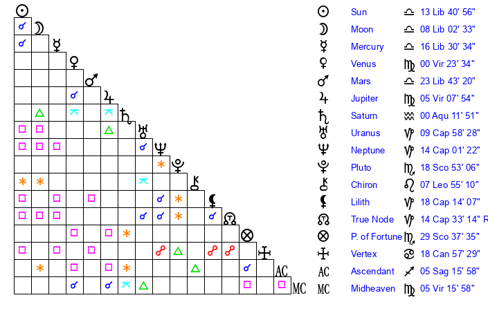 Mars | 23 Libra 43 | 18 Cancer 9 | 16 Scorpio 13 |