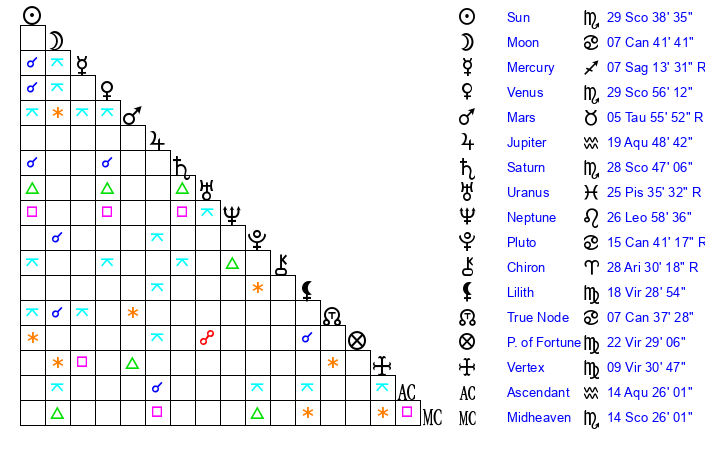 | Venus | 29 Scorpio 57 | 19 Scorpio 46 | 3 Aries 55 |