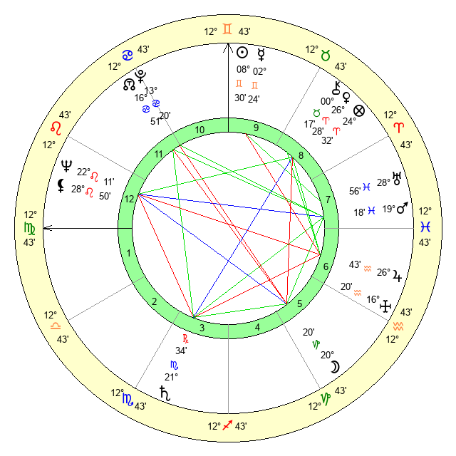 | Sun | 8 Gemini 30 | 9 Gemini 32 | 13 Virgo 20 |