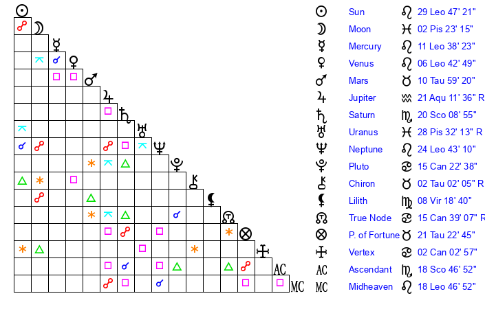 | Moon | 2 Pisces 21 | 6 Virgo 7 | 14 Libra 51 |