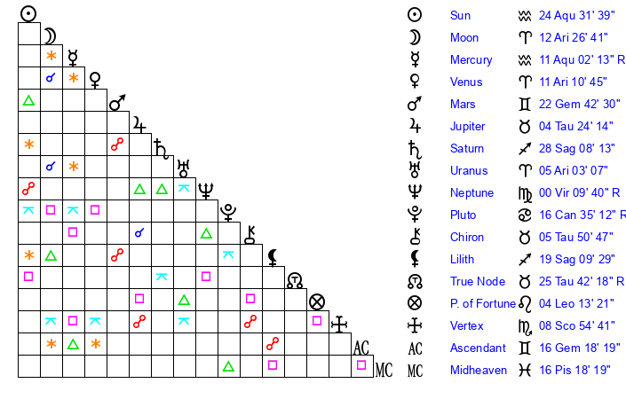 | Sun | 24 Aquarius 32 | 25 Aquarius 15 | 29 Taurus 10 |