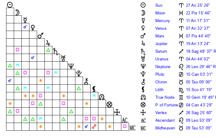 | Neptune | 26 Leo 30 | 0 Aries 39 | 27 Leo 52 |