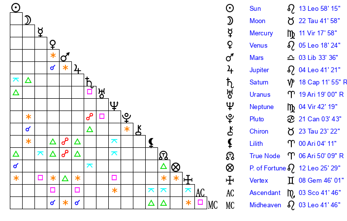| Venus | 5 Leo 19 | 8 Cancer 28 | 2 Sagittarius 13 |