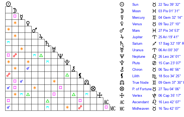 | Sun | 22 Taurus 40 | 23 Taurus 11 | 25 Leo 28 |