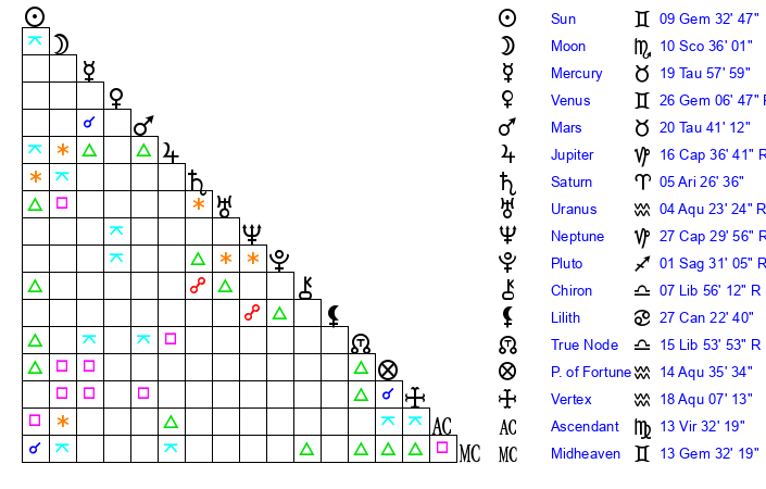 | Sun | 9 Gemini 33 | 9 Gemini 32 | 7 Cancer 15 |