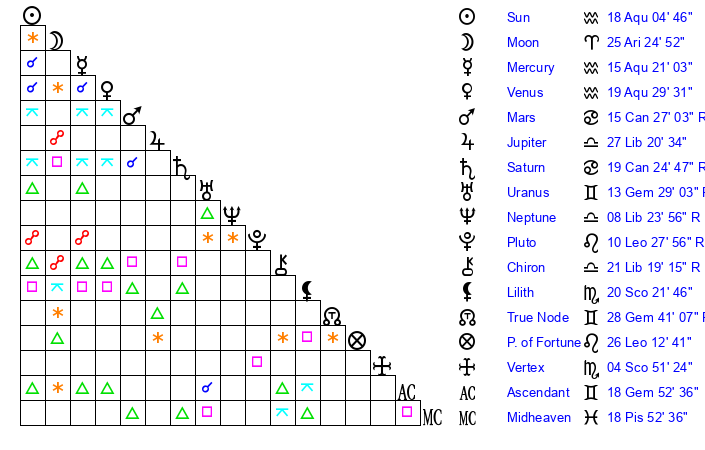 | Sun | 18 Aquarius 5 | 18 Aquarius 55 | 6 Taurus 35 |