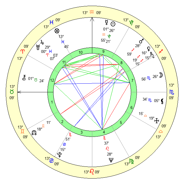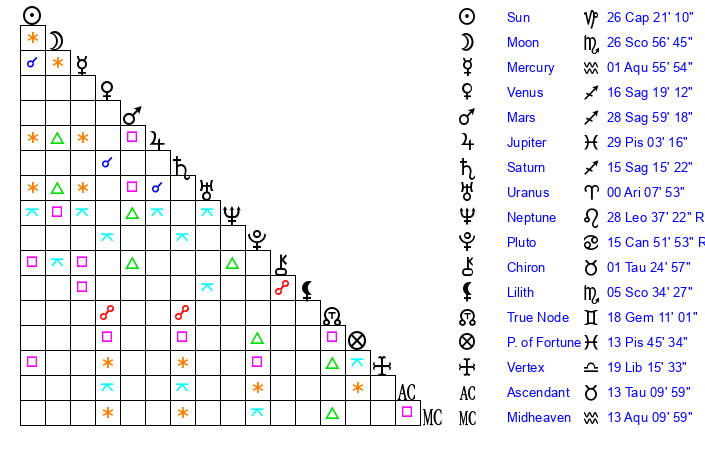 | Moon | 26 Scorpio 55 | 12 Virgo 30 | 22 Gemini 2 |