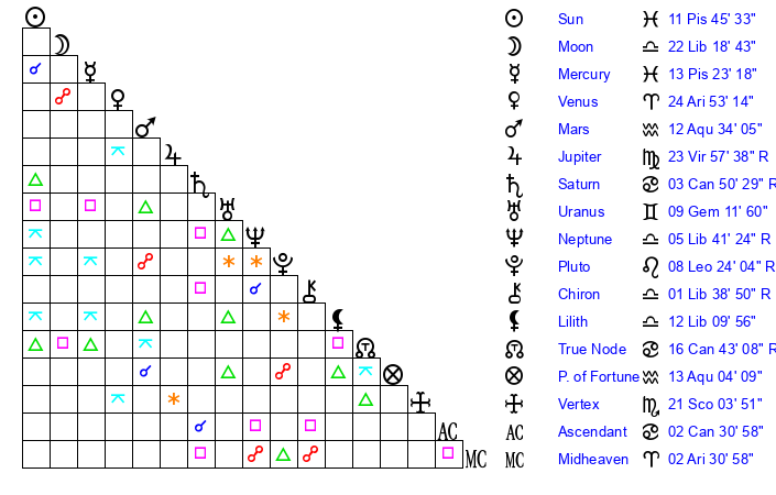 | Neptune | 5 Libra 42 | 28 Pisces 57 | 3 Libra 49 |