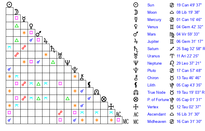 | Moon | 8 Libra 30 | 12 Aquarius 59 | 0 Aries 32 |