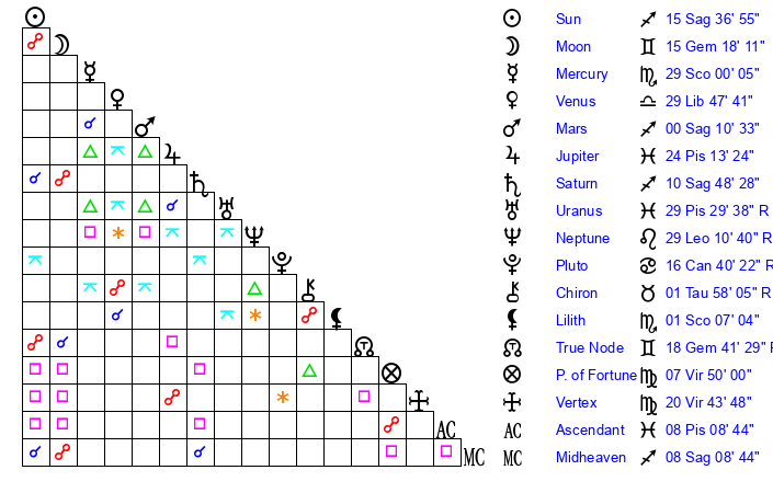 | Mars | 0 Sagittarius 11 | 25 Sagittarius 2 | 12 Aquarius 30 |