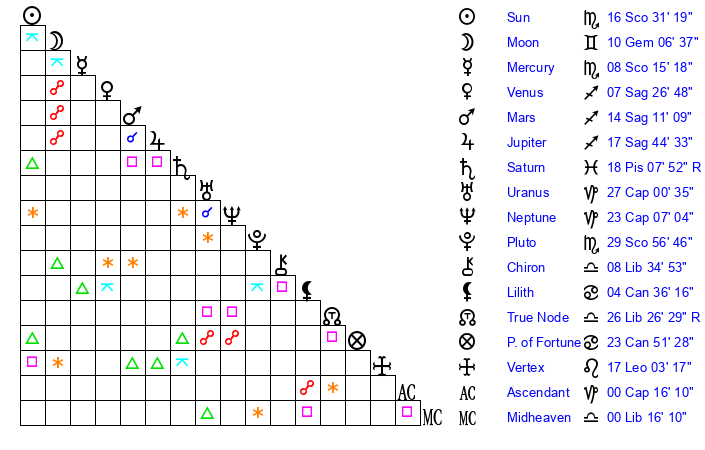 Sun | 16 Scorpio 31 | 17 Scorpio 30 | 15 Sagittarius 50 |
