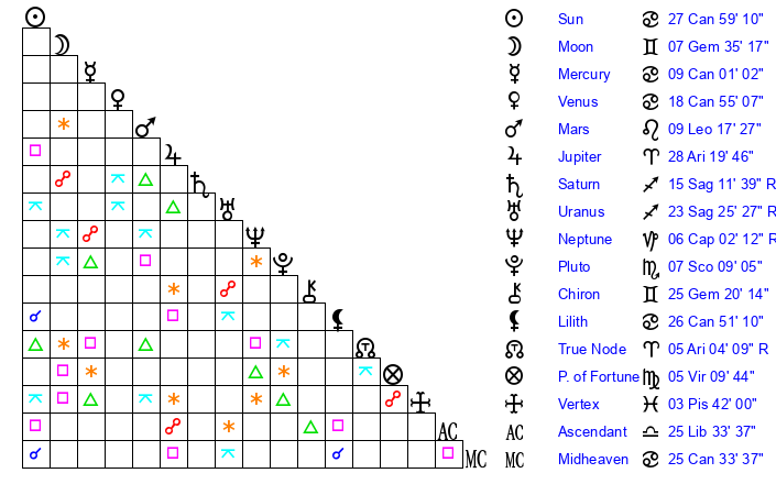 Sun | 27 Cancer 59 | 28 Cancer 46 | 4 Virgo 26 |