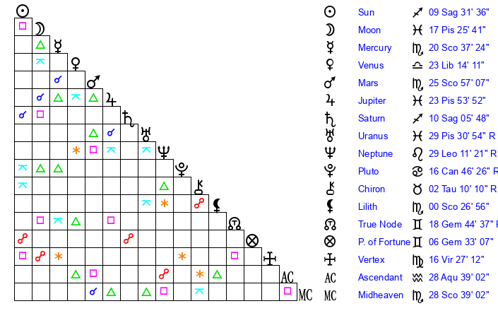 | Saturn | 10 Sagittarius 28 | 25 Pisces 5 | 19 Sagittarius 12 |