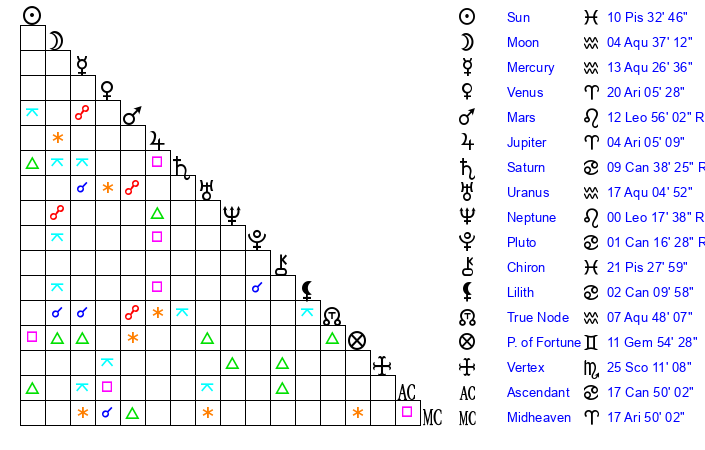 | Sun | 10 Pisces 33 | 11 Pisces 6 | 26 Gemini 50 |