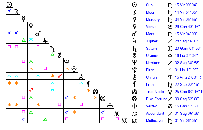 | Moon | 14 Virgo 48 | 14 Pisces 39 | 25 Leo 39 |