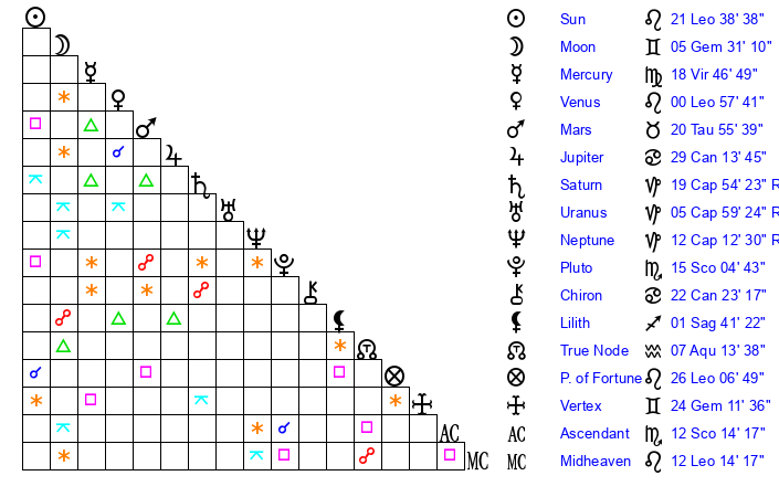 | Moon | 5 Gemini 24 | 2 Taurus 2 | 21 Virgo 32 |