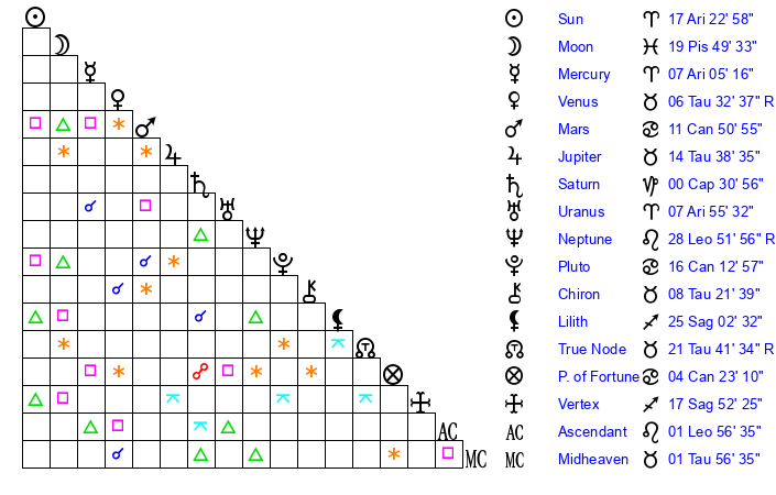 | Uranus | 7 Aries 55 | 25 Taurus 5 | 11 Aries 22 |