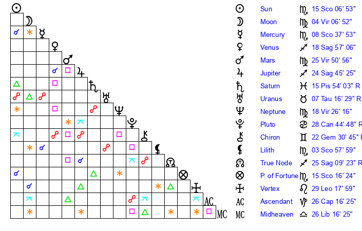 | Neptune | 18 Virgo 26 | 29 Pisces 39 | 18 Virgo 24 |