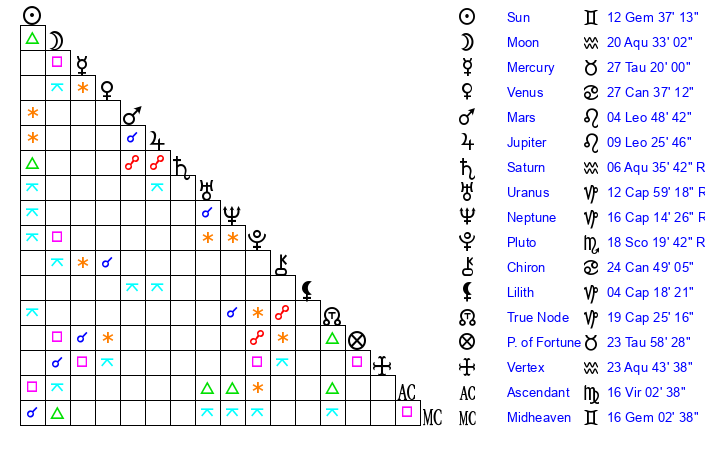 | Moon | 20 Aquarius 21 | 19 Virgo 43 | 18 Taurus 1 |