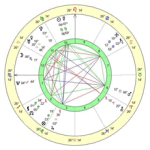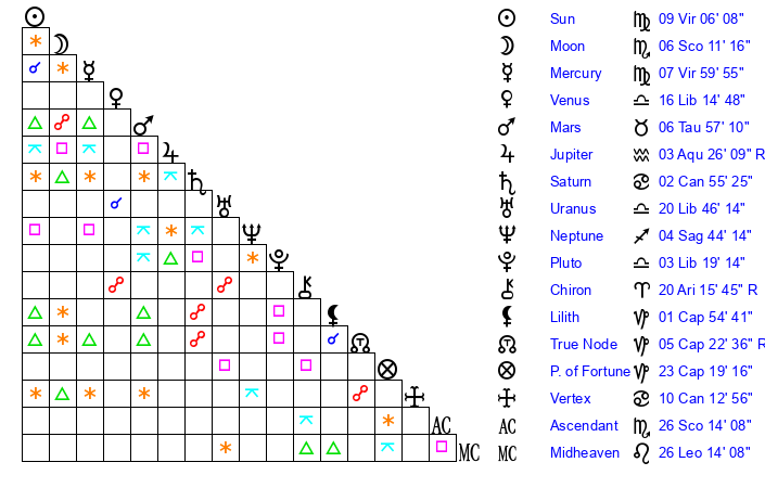 | Sun | 9 Virgo 6 | 9 Virgo 30 | 0 Scorpio 8 |