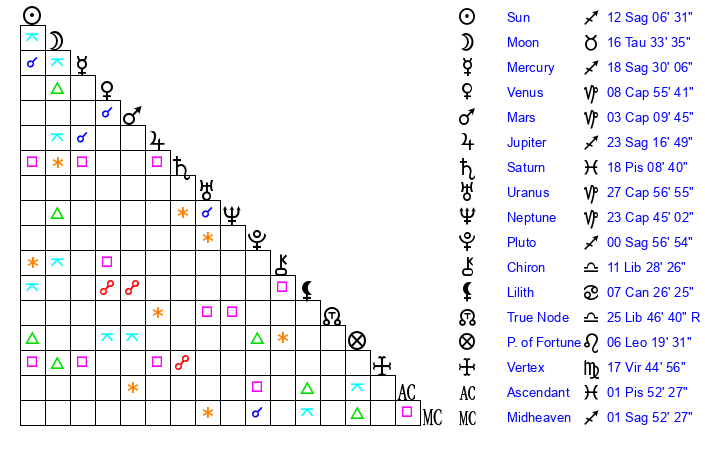 Moon | 16 Taurus 28 | 24 Capricorn 18 | 7 Gemini 39 |