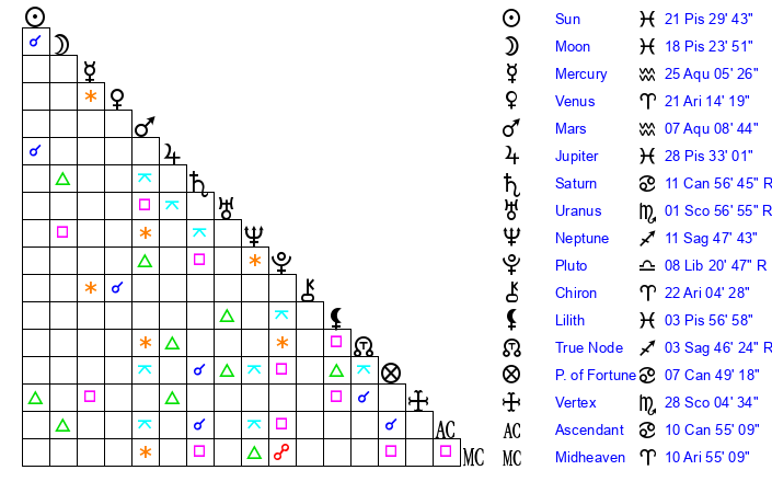 | Mars | 7 Aquarius 9 | 18 Cancer 36 | 15 Pisces 9 |