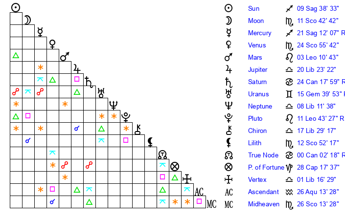 | Venus | 24 Scorpio 56 | 1 Sagittarius 41 | 5 Pisces 27 |