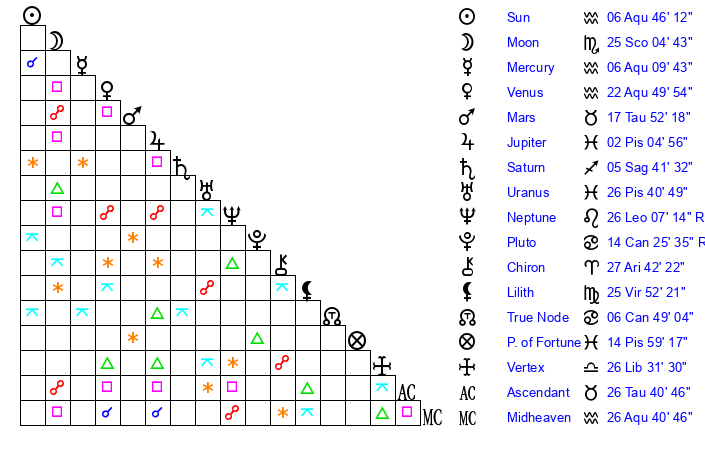 | Sun | 6 Aquarius 47 | 8 Aquarius 1 | 14 Taurus 12 |