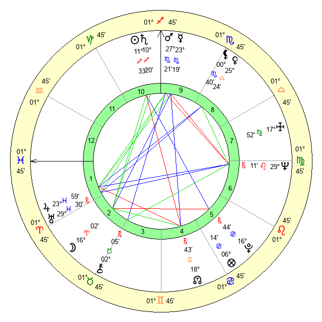 | Moon | 16 Aries 11 | 9 Gemini 5 | 18 Scorpio 53 |