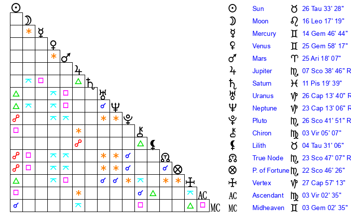 | Sun | 26 Taurus 33 | 27 Taurus 2 | 26 Gemini 16 |