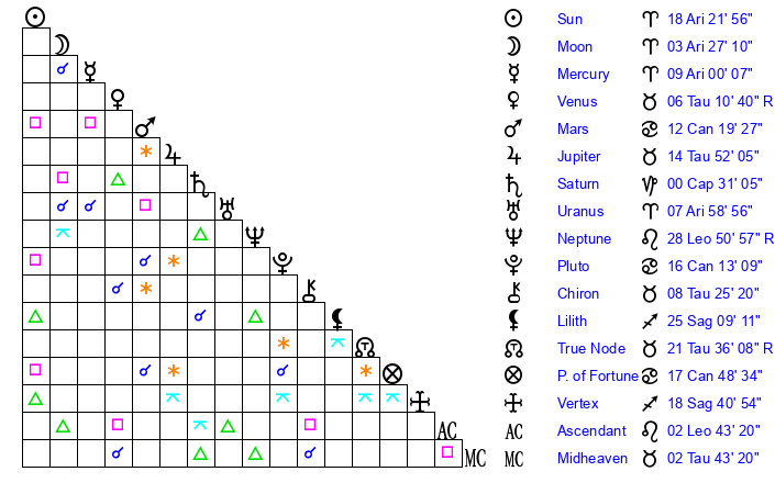 | Sun | 18 Aries 22 | 19 Aries 6 | 20 Cancer 47 |