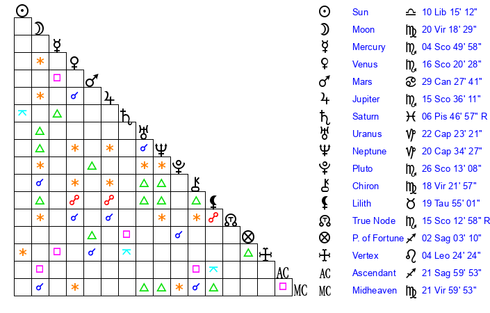 | Moon | 20 Virgo 13 | 24 Aquarius 48 | 12 Scorpio 56 |