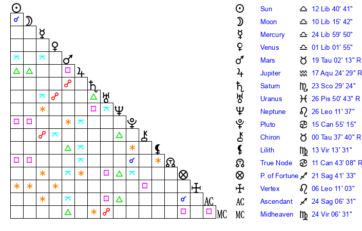 | Moon | 10 Libra 21 | 7 Aries 24 | 1 Gemini 59 |