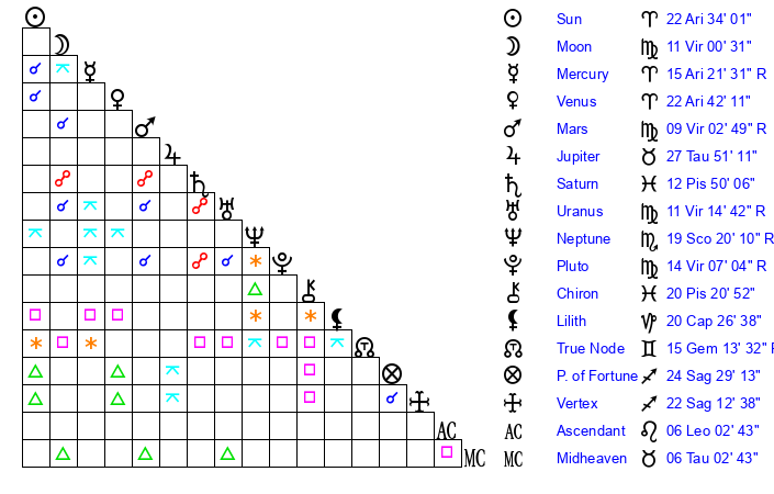 | Sun | 22 Aries 34 | 23 Aries 2 | 20 Gemini 32 |