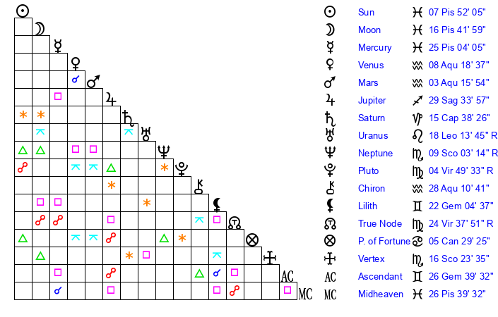 Moon | 16 Pisces 40 | 1 Pisces 17 | 24 Cancer 27 |
