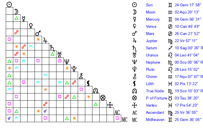| Sun | 24 Gemini 18 | 24 Gemini 50 | 29 Leo 19 |