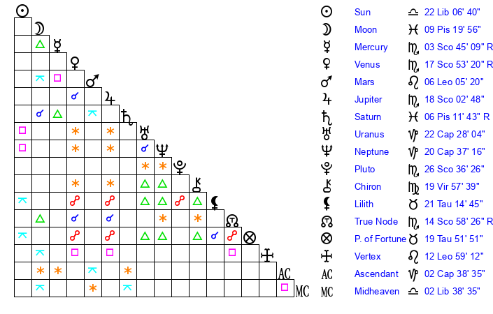 | Sun | 22 Libra 6 | 22 Libra 35 | 23 Scorpio 6 |