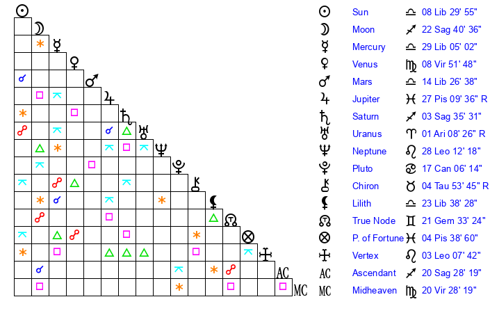 | Moon | 22 Sagittarius 41 | 11 Aquarius 25 | 5 Leo 46 |