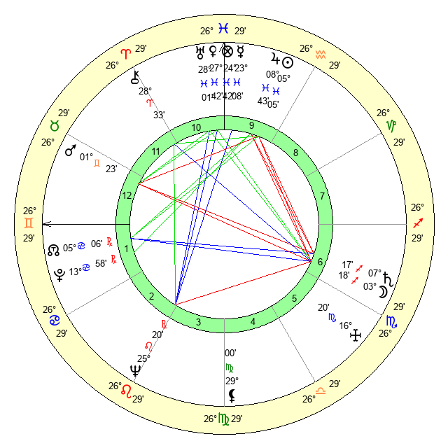 | Mercury | 23 Pisces 9 | 18 Pisces 51 | 26 Gemini 33 |