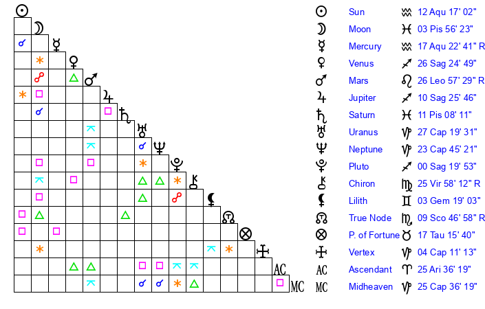 Sun | 12 Aquarius 16 | 13 Aquarius 0 | 12 Pisces 33 |
