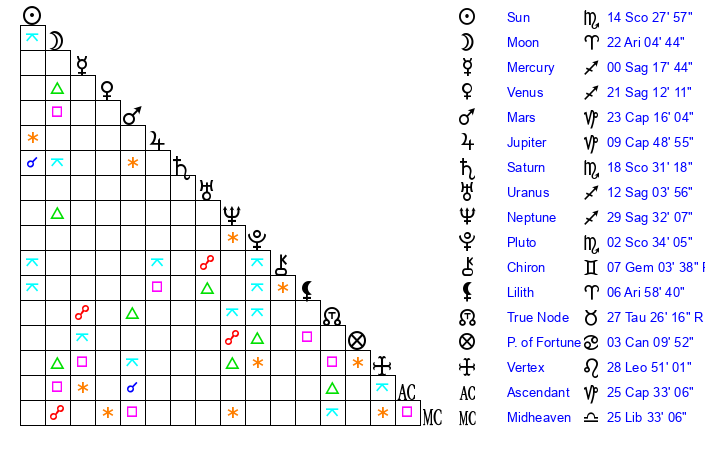 | Saturn | 18 Scorpio 48 | 25 Pisces 27 | 23 Scorpio 33 |