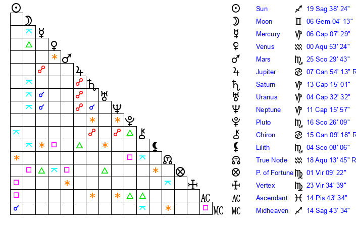 | Sun | 19 Sagittarius 38 | 19 Sagittarius 54 | 26 Capricorn 18 |